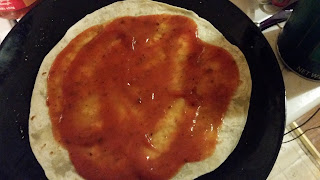 First, I spread a few large spoonful's of the pizza sauce on one tortilla then sprinkled some garlic powder on it.